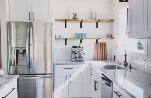 Spacious 4 bedroom house with 3.5 baths. This house has the ability to host multiple or large families. Two large king bedrooms downstairs with a living space and kitchenette. One queen and one twin trundle bed ( two twin mattresses) bedrooms upstairs with main kitchen and living space. Large deck upstairs with outdoor couches and dining table. Large fenced back yard perfect for your four legged friends. The back yard also has seating and a propane fueled fire pit.