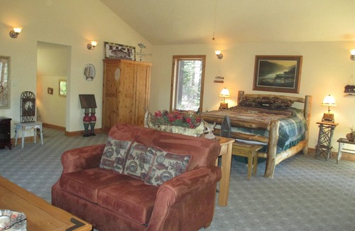 This private studio/suite has lofty views of the forest, gardens and the Feather River Canyon. There is a trail for hiking or mountain biking access to the river for fishing, swimming or rafting. Your accommodation is an 1100 sq ft. suite with high vaulted ceilings and wood beams and is privately situated on the east wing of the owners home. The access is B & B style into a large foyer and up a log staircase and over to the private east wing of the owners home. Restful sleeping is yours with the queen sized log bed and there is a small en suite with a double futon bed. The spa sized bath has a spa tub and separate walk in shower. The bath counter top is granite with 2 copper sinks. Includes Direct TV, full sized coffee maker, mini refrigerator & microwave. French doors access a balcony/deck with bistro table & chairs to enjoy the sound of the Feather River and wildlife sightings while you sip on your morning coffee or relax at the end of the day with a glass of your favorite beverage. There are restaurants, shops, golfing, lakes, gas station, stores & post office within 1 to 15 miles away. Please feel free to contact the owner with any questions.