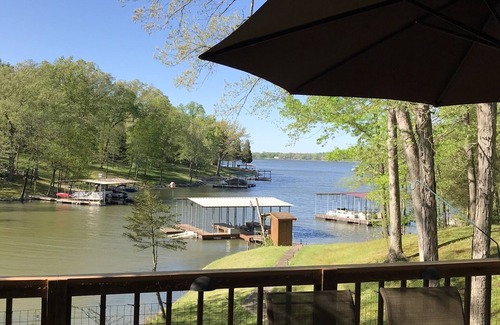 Welcome to the ultimate Lake House that is beautifully situated in a quiet cove right off the ski area with a very gentle walk to your covered boat dock. Every year I put money back into the property and this year was a BIG investment with appliance, stone fire pit, and 240 feet of shoreline cleaned up with new riprap. Last year we replaced the Hvac system, added a queen bed, and new mattresses all thru. We work for your 5 Stars!