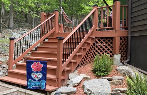 -Enjoy the peace and quiet of our fully wooded lot and beautiful home in the gated community of Eagle Rock outside of Hazleton, PA just minutes from I-81. Our home is a three story, four bedroom, 2 bath, 1 car garage chalet style home. The Lake Beach is a block and a half away and less than .4 miles to the Base Ski Lodge. The property is nestled on two lots providing extra privacy. The house utilizes 4 outdoor security cameras and also has a keyless entry to eliminate key pick up and drop off!