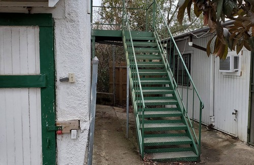 The Eagles Nest is a Studio located in the rear cottage, in the King Williams district, upstairs with granite countertops, wood laminate floors, a computer desk, and a large closet with a dresser inside. There is a queen bed with a smart TV. This cozy studio has all your basic items to feel home away from home. Laundry on site. Bright Sunny Studio is great for traveling, work, or just on vacation. Location, location, location...all our guests love to be able to walk to the Riverwalk, Pearl, Convention Center, hospitals, Tower of America, and be where everything is happening. Fully equipped kitchen with stainless steel stove and refrigerator. Large fenced backyard with table top firepit and patio furniture.