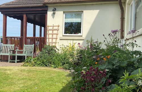 Wooden raised deck area adjacent to the summer house is perfect for early morning coffee and breakfast as the sun rises to look out over the wild meadow and onto the Firth of Forth.