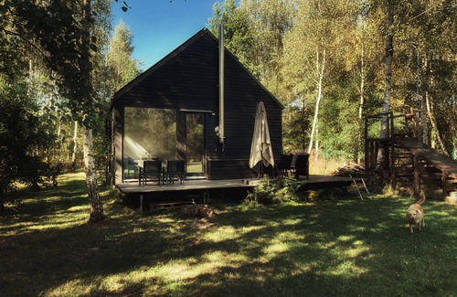Ecologically built year-round unique house by the lake surrounded by forests and nature. Huge windows let you enjoy the sun and nature even from the inside, summer or winter. Water from the well, filtered and safe to drink, ecological and efficient fire-place to keep you warm in the cold season. Recuperation cleans the air, water is re-used for garden watering and toilet flush. No concrete used in the house! Clay walls. No other buildings to within 1km. Canoe, badminton, zipline, bonfire.