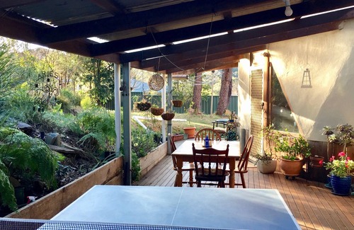 Bedroom 1 is on the ground floor with a queen sized bed and ensuite bathroom. Upstairs is a large mezzanine level with a queen bed and 2 single beds. Out the back there is a covered verandah with table and chairs and table tennis table available for guest use. Surrounded by gardens.