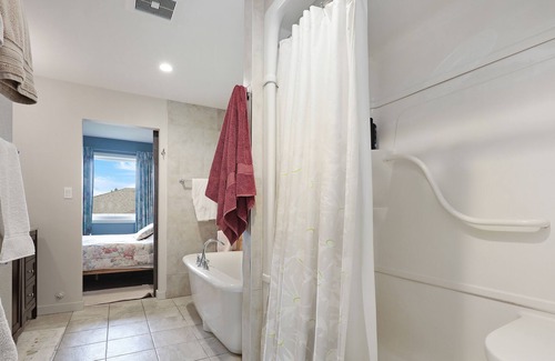 Large 4 piece bath with heated floor- tile surround large tub, shower. Barn Doors on bathrooms. 1/2 bath on the main floor near the front door