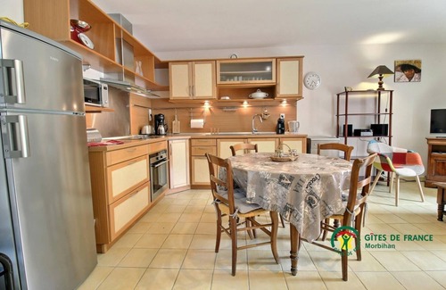 Environmentally friendly lodge adjoining to the owner's in a hamlet 4 km from Plescop, 10 km from Vannes and 11 km from Auray. Kitchen-sitting / living room, 2 bedrooms (1 double bed 160 X 200, 2 single beds 0.80x200), shower, wc, c. ground low temperature wood heating, hot water wood and solar. Terrace, garden furniture, barbecue, private garden of 250 m2. Gite on the ground floor with a small step. Renovated house with a particular care around Ecology: wood, solar DHW heating... The garden provides herbs useful for cooking nice meals.Short stays from 2 nights. For a successful holiday, come and stay at La Bergerie, in a calm and preserved environment, inviting you to rest and relax. Ideally located between Vannes and Auray, the cottage will allow you to shine to discover all the treasures of South Morbihan: Carnac, Quiberon, the Ria d'Etel, the Gulf of Morbihan, Lorient etc...
