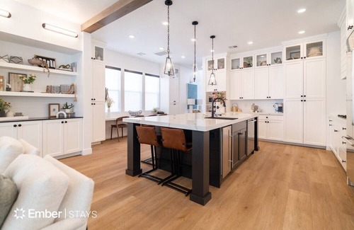Welcome to Edgewater! Edgewater is one of a limited number of premium homes nestled directly on the stunning 2.5 acre lagoon in Desert Color Resort. It can comfortably sleep 36 guests, and includes a heated private pool. It also has all the amenities and luxury details you’d expect from an Ember Stays vacation home – professionally designed and furnished, fully stocked gourmet kitchen, open-concept dining and gathering spaces, and en suite bedrooms for added privacy and comfort.