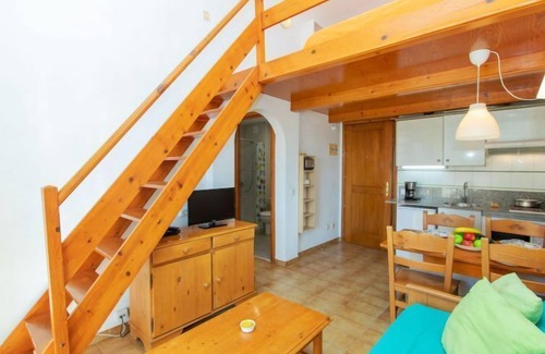 3-room apartment 34 m2 on 2 levels. Living/dining room with dining table, digital TV, flat screen, DVD, air conditioning and forced-air heating. Exit to the terrace. 1 room with 2 beds (90 cm, length 190 cm). Exit to the terrace. Kitchenette (2 ceramic glass hob hotplates, toaster, kettle, microwave, electric coffee machine). Shower/WC. Boiler (50 litres). Upper floor: (steep stair) open gallery with sloping ceilings, ceiling height 130 - 180 cm with 2 beds (80 cm, length 190 cm). Terrace furniture. Partial view of the sea and the swimming pool. Facilities: washing machine, iron, hair dryer. Internet (WiFi, free). Please note: TV only ES. No lift. Instead of an enclosed bedroom, some sleeping areas are located in an open-plan area (gallery, alcove, etc.). HUTG005969 ESFCTU00001700700019295700000000000000000HUTG-0059690