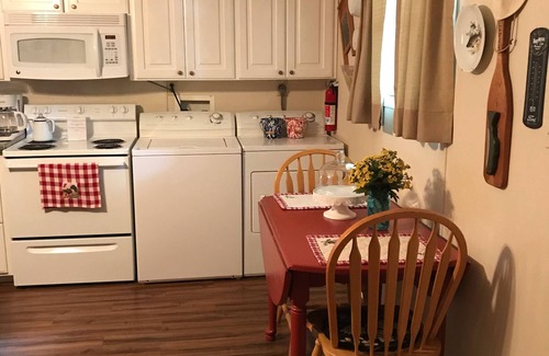 Efficiency apt. located at the back of 2 acres . This is a private apt that is quiet and designed with rest and relaxation in mind. This unit is in sight of our house . There is a neighborhood around us, but woods between us and them. It is close to town but with the feeling of being further out. This is a fully equipped apt. with full kitchen, washer and dryer, wifi, multi tv channels. We have covered parking with patio and gas grill for your use. Outdoor pit when in season. Queen bed with memory foam. Your check in will be at 3:00pm and check out at 10:00 so as to get apt. fresh and clean and ready for next guest.