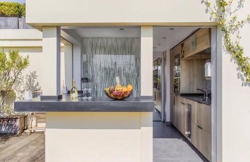 Eiffel Tower lights sweep over the terrace of this bright Paris residence. Potted palms wave over 2 outdoor dining tables, seating, and an outdoor kitchen. City views are on display in the trad-inspired living areas with stone-tile floors and built-in bookcases; there’s also a home theater. It’s steps to Trocadéro, walking distance to several museums, and 6 minutes on foot to 2 Métro stations.