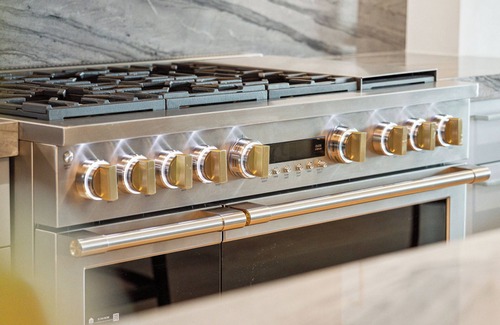 - An open-concept chef's kitchen with walnut cabinetry, quartzite waterfall island, hidden walk-in pantry, and an oversized wet bar complete with beverage fridge and full wine tower