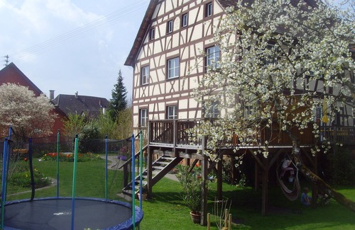 The 90 sq m apartment in an old half-timbered house is sunny and spacious. Wooden floors, the beautiful timber-structured walls and elegant antiques bring style and atmosphere. The kitchen is very well equipped, with a table and morning sun for breakfast. The three rooms (bedrooms and lounge/ dining) are facing south, elegantly furnished and have a warm feel to them. A 60 sq m terrace and sundeck overlooks the lovely garden and provides enough space and privacy for al fresco dining in these warm summer nights. You can also have a barbecue in the garden or play table tennis in our elegant cellar room. We also have two bicycles to lend to guests.