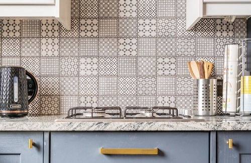 There is a small yet beautiful navy blue and marble counter-topped kitchen to prepare meals at home, a retro dining table to seat 4 to enjoy your creations, and a dishwasher for easy cleanups.