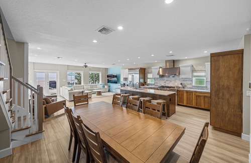 Your private paradise awaits! The first floor features an open, sunlit design that maximizes living space and enjoyment. Relax in the great room, where a cozy fireplace, stunning beach views, and a large TV create the ideal setting for unwinding. Step out onto the expansive outdoor deck for breathtaking views and fresh ocean breezes. The adjacent dining room comfortably seats eight and is complemented by a wet bar with a dual-temperature wine refrigerator. A bedroom with two sets of twin bunk beds and a full bathroom with additional pool/spa access are also located on this floor, along with a convenient laundry facility featuring dual washers and dryers.