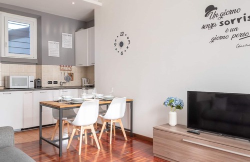 Elegant and modern flat centrally located a stone's throw from the heart of Milan's magnificent Navigli.The flat consists of a spacious and cosy living room with a fully equipped open kitchen, a large bedroom, an elegant bathroom and a small terrace with a view.Located in a strategic position, just a few minutes' walk from the metro and the Milano Romolo railway link.Upon entering the flat you will enter a cosy hallway, which leads directly into the wonderful living room.The living room represents the beating heart of the flat, which thanks to its large and bright spaces will allow you to spend extremely convivial moments in company.You can watch fantastic films thanks to the Samsung Smart TV with Netflix included free of charge, sitting comfortably on the large fabric sofa bed.There is also a small terrace with a view.Also in the same room is a wonderful open kitchen with all kinds of amenities, from the Samsung fridge to the induction hob, from the microwave combi oven to the Nespresso coffee machine, and even a toaster, electric tea kettle and dishwasher.There are also pots, plates, glasses, cups and cooking utensils.Thanks to all this, you will be able to enjoy excellent home-cooked meals on the large wooden table, so you will always amaze your guests.The bedroom is very spacious and well-lit and will allow you to have a pleasant night's sleep thanks to the king-size bed and comfortable memory foam pillows.You will also find a large wardrobe in which you can store all your clothes and belongings.Also in the bedroom is a study/work station, equipped with a chair and desk, which will allow you to work easily in smart-working mode, also thanks to the fibre-optic wifi connection with 500 Mbps speed.There is a very elegant windowed bathroom, equipped with a spacious shower cubicle, toilets and a courtesy kit with shampoo, bubble bath, hand soap, conditioner and body cream.In addition, there are electrical appliances such as a hairdryer and washer-dryer (the latter can be found in the kitchen cabinet).