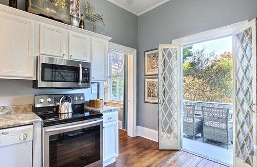 Adjacent to the living room, you will find the well-equipped kitchen featuring a large baker's rack with dishes, convenient small appliances, and lots of cookbooks (the owner's wife is a retired professional yacht chef!). Just outside the kitchen is an extremely luxurious and comfortable porch featuring a dining table and chairs for six which gives you the option of al fresco dining overlooking scenic Hall Street. A comfortable sectional and cocktail table create a wonderful lounging area to enjoy the sights and sounds of Savannah while relaxing with a drink and snacks or later with coffee and dessert.