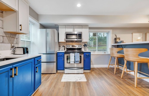 Flooded with natural light from the large windows. The living room is tastefully furnished with a leather couch, chic accent chairs, and a flat-screen TV equipped with streaming services. It's the perfect spot to unwind after a day of exploring the city. The modern kitchen has the appliances you need and all the cooking essentials you'd need to prepare a gourmet meal. Both bedrooms are have smart TV. Plenty of shops, supermarkets, the World of Coco Cola, Mercedes Benz Stadium, Midtown, West Midtown, Downtown Atlanta, and Downtown Decatur. Quick and easy access to the highway and Atlanta Airport less than 20 mins. Perfect for business traveler.