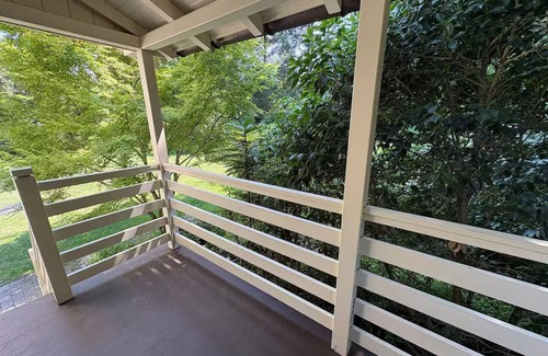 Relax in this calm, stylish studio on a secluded lot within the suburbs. You'll appreciate the private porch with table for two as well as the stunning garden and in-ground pool in season. Queen bed plus a full Murphy bed that folds up into a large desk. Unit has washer/dryer, minifridge, microwave, and Nespresso. Dedicated off-street parking. Perfect for college visits, romantic get-aways, writing retreats, or family travel. Close to major highways but feels a world away. No pets or parties.