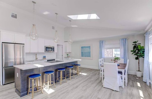 Inside, you’ll find an elegant retreat designed for a relaxed, elevated stay. Sunlight pours through the windows and skylights, offering views of the harbor and street below. The open living area has room to relax or stream your favorite shows, and the renovated kitchen makes it easy to cook in or bring back takeout from the countless nearby restaurants.