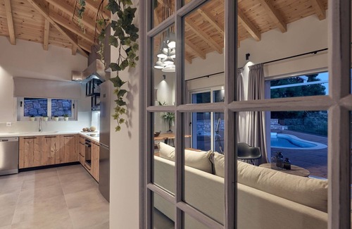 Step into the heart of Villa Chris, where an open-plan living room seamlessly blends with a sophisticated dining area and a fully equipped kitchen. This harmonious space is not only ideal for socializing but also facilitates culinary adventures with modern amenities at your fingertips. As an added convenience, the living room features a double sofa that effortlessly transforms into an extra queen-sized bed, ensuring ample sleeping arrangements for larger groups or families.