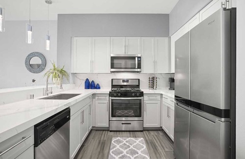 The soft grey walls of this one-bedroom, one-bathroom condo are offset by pops of delightful deep blue and teal, making for a soothing backdrop to a comfortable-yet-elevated space. A renovated, spacious kitchen boasts updated appliances, a deep farmhouse-style kitchen sink and plenty of counter space. The living room features a bar cart with a full complement of bar accoutrement, a plush sofa and two movie theatre-style electric recliners, perfect for taking in a show on the super-sized Smart TV. The bedroom houses a king-size bed, offering ample comfort for a restful night's sleep, along with a roomy walk-in closet for plentiful storage and a sizeable Smart TV. The private office nook off of the bedroom makes working from home easy with a convenient workstation, and the renovated bathroom with a luxurious triple shower head makes for the ideal relaxing end to your evening.