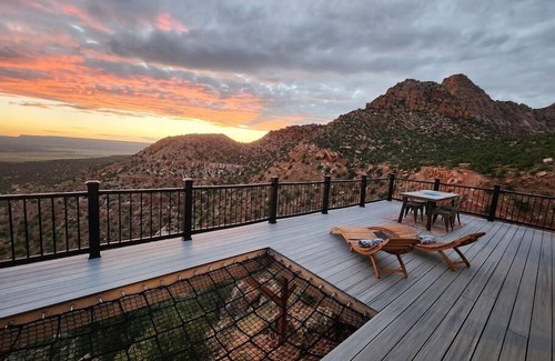 Indulge in the ultimate desert escape with our captivating cabin perched on a sprawling 40-acre desert oasis in South Zion. Be transformed to a realm where untamed beauty meets modern comfort, where the vastness of the desert landscape becomes your personal sanctuary. A rugged 4x4 path leads you to a hidden gem that promises an unparalleled retreat. Perched atop a mountain, our charming cabin awaits, a harmonious blend of rustic charm and contemporary luxury.