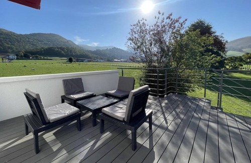 Apartment on the upper floor of the owners' house, near the village of Mendive, 11km from St Jean-Pied-de-Port. Private access via an external staircase leading to the terrace. Equipped kitchen (induction hob, oven, dishwasher, fridge freezer), lounge area (fireplace/stove), 1 bedroom (1 double bed), bathroom (washing machine), toilet. Attic floor (spiral staircase): 1 bedroom (2 twin beds). Electric heating and wood included. Rental of sheets and towels. Terrace adjoining the living room with garden furniture, deckchairs and barbecue. Parking. Beautiful view of the mountains from the terrace. Hiking trails nearby. Iraty 22km away.
