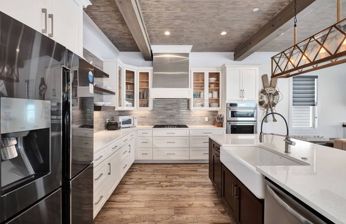 With 6 bedrooms and 6.5 bathrooms, there's plenty of room to spread out, but the true showstopper is the top floor. This luxurious entertainment level features a chef’s kitchen fully equipped with high-end tools, a breakfast bar for four, and a striking wood dining table that comfortably seats 10. A separate bar area includes an ice maker, beverage cooler, and seating for four more.