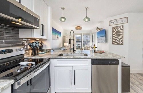 The Emerald Gem is a cozy & absolutely stunning modern condo, recently renovated in 2023 in the sought after Sandpiper Cove Resort. Enjoy amenities, amenities, amenities! Start with a cool beverage of choice right outside your bedroom door or a meal at the picnic style table on your large private patio overlooking the grassy area, horseshoe pits & pool area. There is plenty of space to cook in and eat in the A/C in the newly remodeled kitchen with high-end granite countertops and a breakfast bar with seating for 4. Relax on the soft leather sofa that converts to a queen size bed with memory foam mattress for sleeping. Watch movies, play board games and visit in the living area that overlooks the large deck through the windows. Snuggle up in the intimate bedroom on a queen size bed with patio door that leads to large outdoor space, and let the kids enjoy the built in hallway twin bunks!