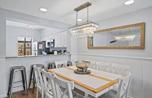 Emerald Haven has a large, open floor plan to allow for conversation with plenty of seating to sit and enjoy the large screen televisions, birdwatch out the back patio or watch the sunset over the lake. The villa is renovated with brand new flooring, tasteful beach decor and a cozy atmosphere. The eat-in kitchen features a cooktop, large island, granite countertops, Keurig coffee maker and stainless-steel appliances. Just bring the food and coffee!