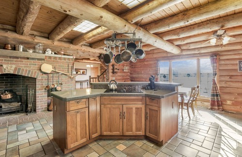 This two-story log cabin nestled in the middle of a picturesque 15-acre wooded property is the holiday destination you’ve been searching for.