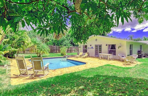Think Beach, heated salt water pool, and hot tub. King beds. Fast internet. A peaceful, clean, tropical getaway. The back yard is a true oasis with a large pool, palm trees and a mango tree. Old Florida sandy beach just two miles away. Dearborn Street shops and restaurants just a mile away and Lemon Bay is only half a mile away. Fast internet with and television. Enjoy a great grilled meal indoors or out . Sit under the arbor with the rapidly growing Bougainvillea and passion fruit.
