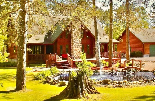 2,900 ft uniquely detailed log & stone cabin sits recessed on 10 acres of beauty. Front yard has a large porch, pond, fountain & stream. The back yard is especially spacious, entirely secluded, with wide trails throughout the woods of the back 9 acres. Solar lanterns illuminate both yards & the trail in the evenings.