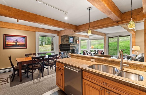 This charming, slope-side condo features an open floor plan that conveniently combines the kitchen, living room, and dining area. The kitchen comes fully equipped with modern stainless steel appliances, utensils, gorgeous granite countertops, and plenty of space. The dining table accommodates six people. The main living area offers beautiful mountain views, a wood-burning fireplace, and flat-screen TV. Guests will also enjoy the mountain side outdoor patio equipped with a gas grill.