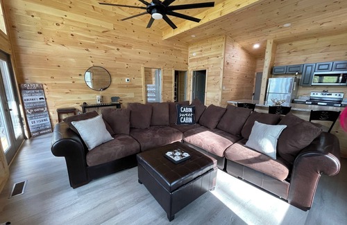 Conveniently located on your way to Red River Gorge/Natural Bridge geographical area from I 75/I 64. This newly constructed cabin boasts 970 sf of open floor plan. With its beautiful ceiling lines up to 14 ft. tall, you get the feeling of being in the mountains with all the comforts of home. This 2-bedroom cabin sleeps 6 comfortably. Bedroom 1 has a queen size bed, dresser, high chest, nightstand, a 55” smart TV, and closet. Bedroom 2 offers a beautiful Northern Minnesota pine queen bunk bed, high chest, and closet. The bathroom offers a new washer and dryer, and 48” sink with mirror and a stand-up shower. The family room/kitchen combo has everything you need to enjoy family time. 55” smart TV, 10 different board games/cards. Fully furnished kitchen with coffee maker, toaster, blender, and ice maker. All dishes, pots, pans, and utensils for 6 guests. All linens, pillows, and towels are included. Large 300 sf deck with 4 lounge chairs and 2 oversized gliders to watch the sunset/sunrise. FREE WI-FI