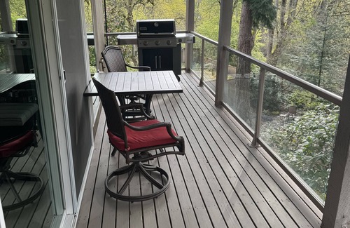 After sharing our ground floor apartment for 12 years as Premier Hosts, with over 200 five-star reviews (VRBO #341581, https://www.vrbo.com/341581?unitId=341581), we are ready to welcome you to our second place! This newly completed fully contained apartment in our family home in a quiet residential neighborhood is reached by a separate entrance one floor down from street level. This unit boasts a spacious open concept living/dining/kitchen area with all appliances. You’ll have full refrigerator, gas stove, dishwasher, microwave and a lovely gas fireplace. The kitchen is fully stocked with cooking utensils and dinnerware. You’ll enjoy a comfortable leather sofa with two recliners which provides perfect viewing spot for 75inch smart TV. The table seats 4 guests with multiple other seating areas for your group. The room has a lovely outlook to the wooded garden with a view of the Burke-Gilman trail with outdoor access to the full length deck through sliding doors. On the deck you can enjoy the view or grill on the large handy gas grill. Garden, patio and fire pit use by arrangement.