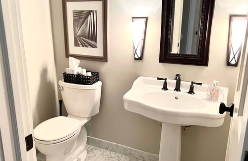 High ceilings with a grand foyer staircase leads up to two large bedroom suites (located on the Upper Level), plus an open 3rd bedroom area with a stellar windowed cupola. One bedroom suite has a wood-burning granite fireplace with a walk-in closet, and a half bath (toilet & sink). The second bedroom suite features a large closet, plus a full bath (shower, toilet & sink). All three bedrooms have queen-sized beds complete with luxury linens and comfy, fresh pillows. Both bathrooms are outfitted with luxury towels and some basic toiletries that you may need during your stay. Note that the 2 bathrooms are located on the second story, on the bedroom level.