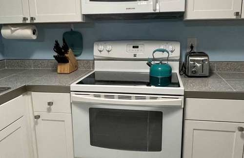 Step inside the house to find a charming interior. The three bedrooms are furnished. The master bedroom on the first floor has a king bed, while the rooms on the second floor feature a double bed and bunk beds that are double sized mattresses. Clean towels and linens will be provided for the bedrooms and the two bathrooms. In the kitchen you will find an electric stove and microwave, perfect for culinary adventures, and a dishwasher for effortless clean-up after meals. The kitchen is fully stocked with equipment that ensure you will have everything you need at your fingertips.