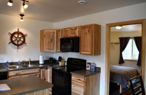 Immerse yourself in the peaceful beauty of Alaska surrounded by old growth hemlock and mountain views trees yet only minutes (by car) to the Seward Small Boat Harbor and Downtown. This is a perfect location and set up for people either traveling as a group or traveling independently. Each Suite is completely separate from one another with their own private entrance yet right next door to someone who you might be traveling with. Everything from the dishes to the furniture is Brand NEW!! This Suite is equipped with a full-size kitchen with every appliance, one full size bathroom with a shower/tub combo, one queen size bed in each bedroom, and one queen size sleeper sofa in the Living Room. This Suite has its own private Washer and Dryer in the oversized bathroom for your convenient use. There is an iron and ironing board available for your use in the designated Laundry Room on the first floor between the REEL and Alpine Suites. You will enjoy the comfort of this Suite while feeling the true Alaskan experience surrounded by nature yet only minutes (by car) from town.