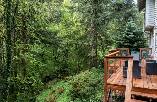 The outdoor deck overlooks beautiful secluded forested hill. There is a covered portion with dining table and gas grill, and a larger open area with outdoor seating and coffee table. It feels so peaceful to be sitting out here.