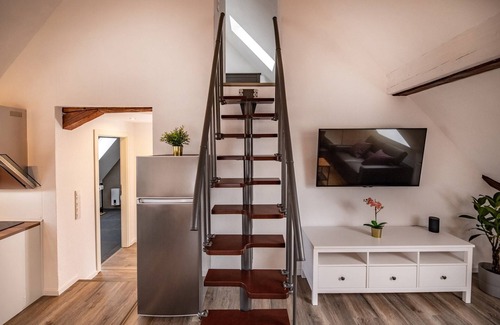 The beautiful 4-room attic apartment is located in a central yet quiet area in the mud and mineral spa Bad Buchau. A bathroom with daylight and rain shower rounds off the bright, lovingly furnished apartment.