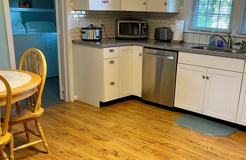 Inside you will find a living room with the original log walls. The sofa opens to a queen size bed. This room was the extent of the original home in the early 1900's. There is one nice size bedroom with queen bed. The large country kitchen is fully equipped for cooking meals so you can avoid the crowds at the local restaurants. The kitchen table seats four comfortably and there is a card table and four folding chairs for larger dinner gatherings. The kitchen opens into a small den with Cable TV. Also off the kitchen is the bathroom/laundry room with full size washer and dryer. The beautiful sunroom is furnished with wicker chairs--a great place to read and sip coffee in the mornings. Off the sunroom is the deck, complete with table, umbrella and chairs--another great place to relax!