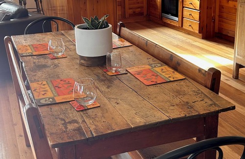 The large pine dining table seats 8 and 10 at a squeeze and has an overhanging light. Plenty of seating zones with 4 leather couches, and the house is furnished with rustic pine pieces of furniture. The 2nd living area is smaller with 2 couches, chairs and is an alternative space.