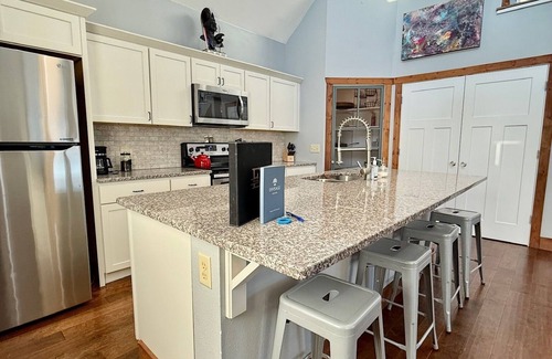 The retreat features two cozy bedrooms with queen beds, a bathroom with a relaxing bathtub, an equipped kitchen, and on-site laundry. This space is perfect for friends, two couples, small families, or solo travelers looking to escape the hustle and bustle. A comfy futon in the loft provides additional sleeping space, and there's room for an air mattress (not provided by Envisage) if needed.
