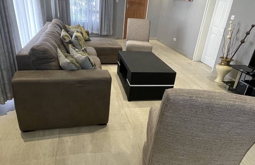 Luxurious, spacious modern home in a quiet room. 3 bedrooms all ensuite with showers. Guest toilet and open plan lounge/dining. Secure and family friendly. Back up electricity and borehole water. Walking trails for the morning and afternoon strolls.