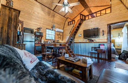 Take it easy at this unique and tranquil getaway. We have all the amenities you will need for a great stay away from the hustle and bustle of your everyday life. A stylish little cabin in the country with access to walking trails, a pool, and a hot tub($) at the main house, which is a short walk up the hill. We have farm animals, and we run an animal rescue that can have anywhere from 14 to 32 dogs. They stay in a fenced-in yard where the pool is located. They love to swim with guests!