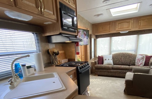 Escape the hustle and bustle by staying in a private RV that has all the amenities of home. Electric fireplace, fully furnished kitchen and bath, has all cookware and linens. All you need to being are your clothes. Sits in a private wooded park. Can accommodate up to 4 guests-has 1 full bedroom and a pull out sleeper sofa. Very private but close to grocery and retail stores.