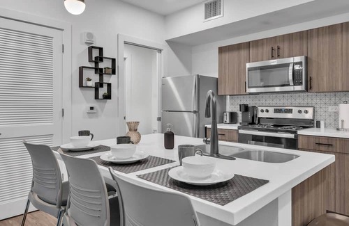 -Fully equipped kitchen with stainless appliances including a refrigerator, stove/range, dishwasher, and microwave with an oversized bar for serving meals or entertaining. Essentials included consist of cookware, Keurig pod coffee maker, houseware, linens, and more.