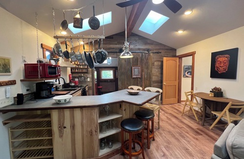 Escape to tranquility in our Cozy Romantic, Newly Remodeled Cabin nestled in the heart of a majestic redwood forest and sculpture garden, which offers a serene and tranquil haven away from the hustle & bustle from the rest of the world and a peaceful embrace of nature. One of the most magical features is a dome-shaped bedroom with a dome window allowing you to wake up to golden morning light filtering through the trees and fall asleep under a canopy of stars.