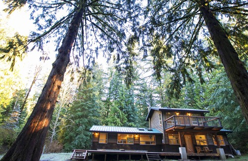 Get away and feel the freedom of the forest in this beautifully remodeled, custom, secluded home sitting on an idyllic forested 1.5 acre lot : playground! Close to Mt. Baker Ski Area in the town of Glacier, WA. This is a fully remodeled, modern industrial style cabin set in a magical locale with huge forest views throughout and calming sounds of the Nooksack river and songbirds. Enjoy the sights and sounds of nature from anywhere on this special property. A mini adventure awaits right out the front door: Deer grazing through the front yard for breakfast; snow slowly falling in the cold of winter; mystical rays of sunlight beaming through the large conifers; woodpeckers playing their tune; dripping moss covered cedar, fir and hemlock trees; robins feeding their young; rainforest vibes all around; old growth trees spreading across the property - along with direct access to Hwy 542 that leads to all your bigger adventures. The custom finishing touches are what separate this cabin from all the others. Priced well below market for its size, seclusion and feel. Also, check out our midweek prices. No details were overlooked with this renovation from the one of a kind concrete and steel I-beam kitchen island to the cedar clad tongue and groove vaulted ceilings; the abstract force-rusted steel skirt with weathered driftwood looking cedar siding to the modern infused craftsman architecture; the oversized master bedroom with vaulted T&G ceilings to the huge 2nd story master concrete deck, steel posts, stainless steel cables, beautiful locally milled fir timbers, oversized concrete footings, and exposed metal construction. Some of the many other touches include: Solid Canadian maple hardwood floors, custom tiled bathroom floors, modern sinks/fixtures/appliances/finishes, huge outdoor deck with covered bbq and seating area, tons of windows and skylights, large open kitchen floor plan made for good times and good food, laundry under the stairs, mudroom at entrance with local artisan built coat rack and slab bench, custom local timbered archways, downstairs bedroom with large full size loft bed, 50" Sony flat screen smart TV in living room, unique steel backsplash, custom walnut kitchen cabinets & bathroom vanity, custom concrete countertops, more locally milled cedar and fir timber details throughout the interior and more! Lopi Evergreen wood stove! Close to world-class skiing and snowboarding at Mt. Baker Ski Area, classic hiking trails, all-time mountain biking, fishing, lakes, kayaking, river rafting, floating and oh so much more. Come experience the magic at the end of the road in this one of a kind getaway! Close to all Glacier shops and restaurants. WiFi included. Stocked with all your kitchen, bath, and bedding needs. (We have a smaller cabin in the area, but still awesome. Check out our A-Frame down the hill in Maple Falls at VRBO #782205.) !!!